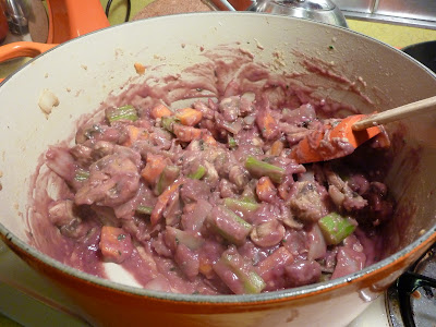 Cook the flour a bit so that your dish doesn’t taste like paste. Add 1 cup wine (the entree description mentions a Cabernet sauce, so I used a Cabernet). Don’t worry about the funny purple color the dish has… it comes out fine đ