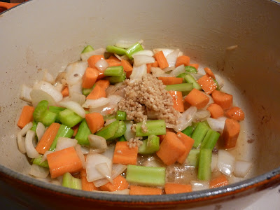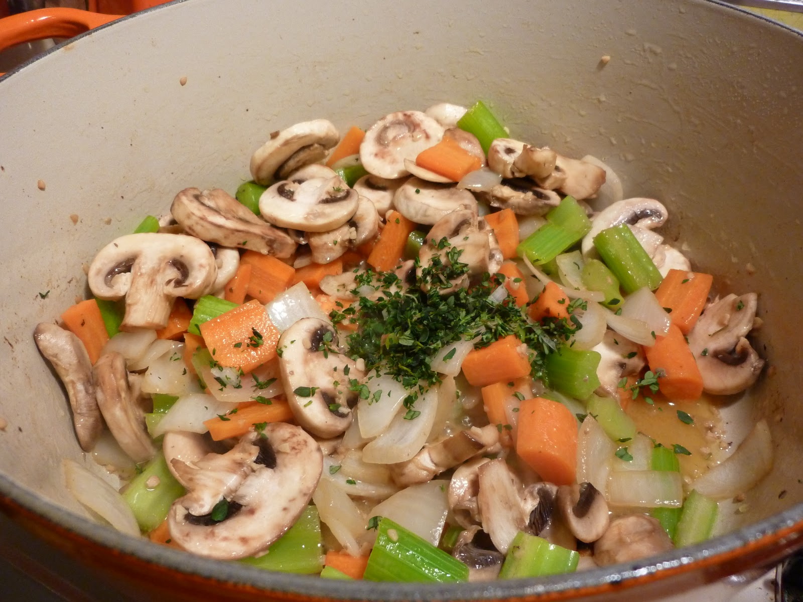 - Melt butter in the pot and add the carrot, celery, onion, garlic, mushrooms, and thyme. Cook until the vegetables are tender.