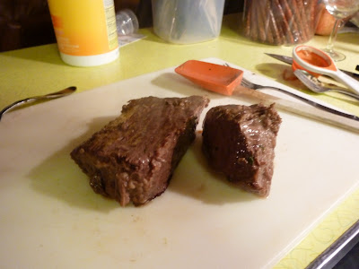 First of all, I heated 1/4 cup of vegetable oil in my pot. Then I seared the meat on all sides. I used about 2 1/2 pounds of chuck roast. The recipe calls for 3 pounds boneless beef shoulder roast.